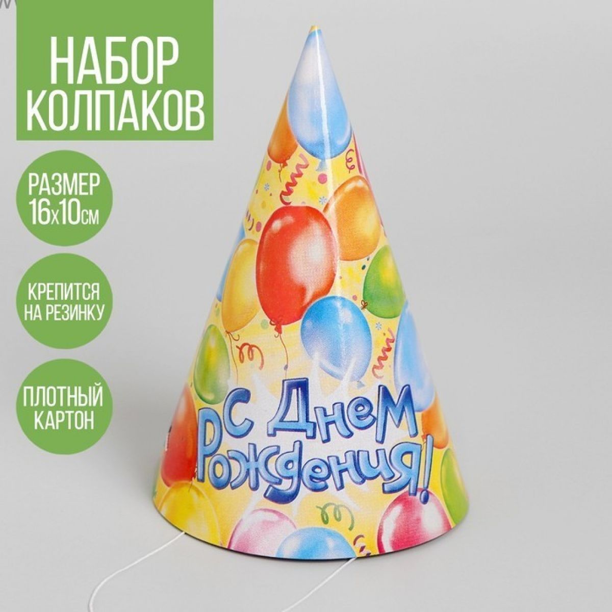 Колпак праздничный бумажный <С днём рождения>, 16 см набор 6 шт